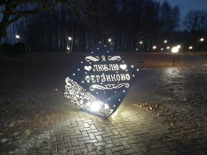 25 ноября в Ферзиковском парке культуры и отдыха «Дубки» появился новый необычный объект – металлический резной памятник «Я люблю Ферзиково». Он объемный, имеет форму куба и на всех гранях резные узоры.