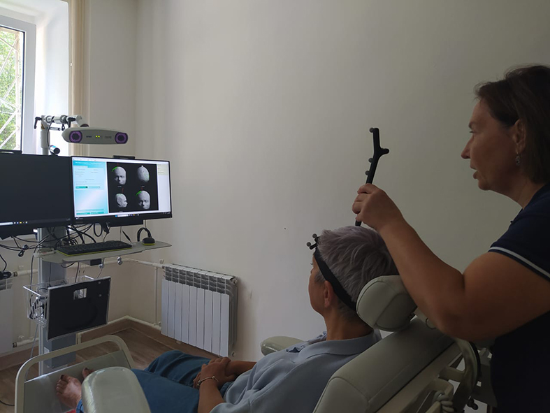 Жемчужина отделения – аппарат транскраниальной магнитной стимуляции с системой навигации. Он позволяет воздействовать на определенные точки коры головного мозга при помощи коротких магнитных импульсов и тем самым лечить различные неполадки в организме после перенесенного инсульта, недержание мочи, нарушение глотания, болевые синдромы невралгического характера или при растяжении мышц, например, и много других симптомов. В умный аппарат загружают МРТ пациента, соотносят это изображение с реальным человеком в кресле с помощью электродов, находят точку, отвечающую за те или иные органы, двигательные функции и так далее, и воздействуют на нее импульсами. Это реально космос. И такие аппараты есть только в НИИ неврологии и двух-трех реабилитационных центрах в Москве. Ну как тут не гордиться, что теперь прогрессивное лечение доступно и пациентам Калужского региона.