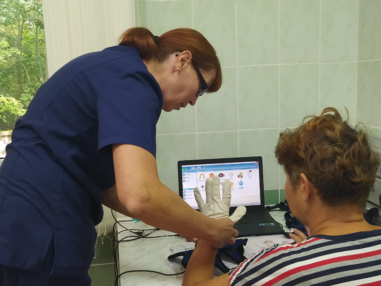 С возможностями реабилитации познакомила нас заведующая отделением Вероника Цурикова. Помимо известных многим беговой дорожки, велосипеда, имитации ступенек лестницы, вертикализаторов, гравитонов, физиолечения и множества аппаратов для разработки конечностей с трудными названиями есть умная электронная перчатка, позволяющая прорабатывать все участки кисти руки в игровой форме. Хубер-платформа тренирует вестибулярный аппарат, помогает держать равновесие. В ее программе заложен даже тренинг для горнолыжников, но в реабилитационном центре она помогает пациентам просто научиться контролировать свое тело, движения и не падать.