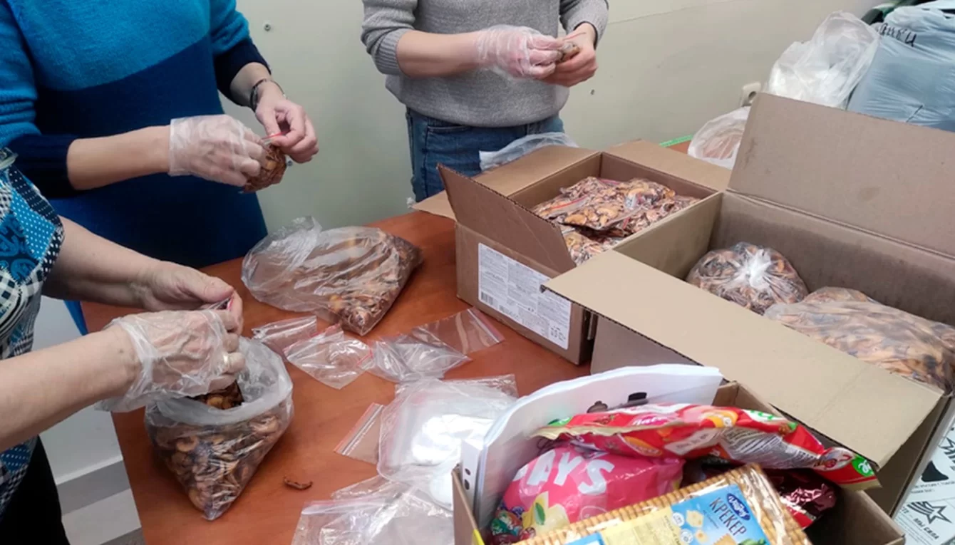 Столы в комнате уставлены ящиками, в которые раскладывают продукты. Здесь же стопки вещей – уже готовые к отправке толстовки, балаклавы, снуды. Все это добровольцы шьют дома из материала, закупленного на средства благотворителей, и приносят сюда. Дома же начали делать и заготовки для блиндажных свечей.