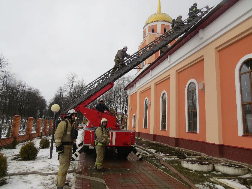 Условный пожар в моленном зале достиг площади 80 квадратных метров, существовала угроза распространения огня на горючее перекрытие и соседнее помещение.