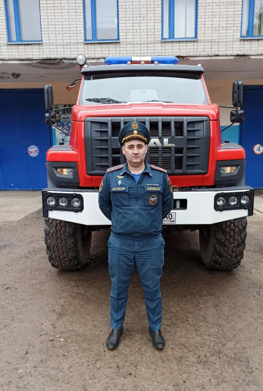 Комплект боевой одежды у Сергея Сазонова всегда рядом. Даже дома один есть. Начальник пожарно-спасательной части - должность совсем не кабинетная. Он выезжает на все крупные пожары. Дома уже привыкли, что папа может сорваться на работу в любой момент. Время, когда можно побыть всем вместе, заниматься уроками с сыном-первоклассником, просто гулять с ним во дворе, он ценит особо. Конечно, приводил сына Матвея к себе на работу - и каску разрешил примерить, и в пожарной машине посидеть.