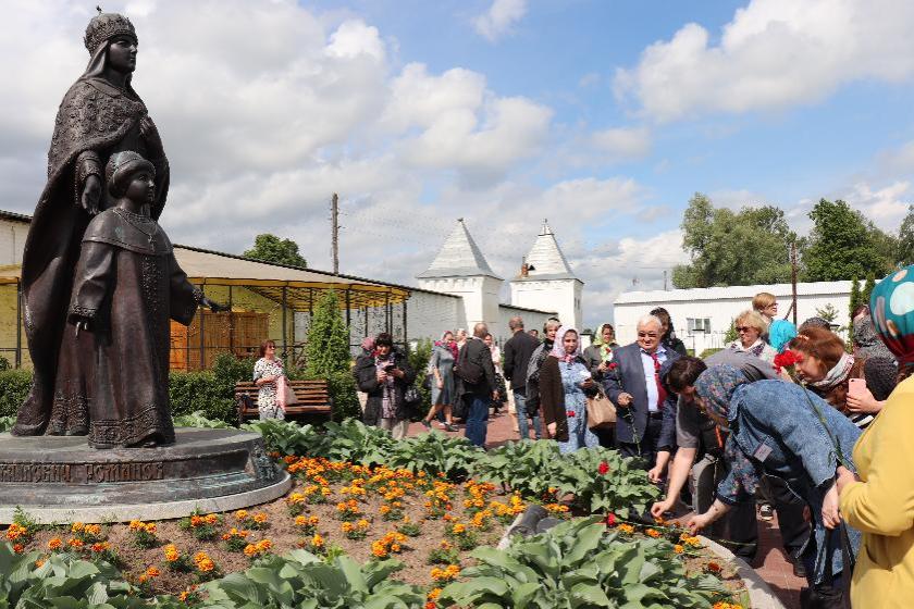 У стен Георгиевского монастыря установлен памятник Евдокии Стрешневой и царевичу Алексею.