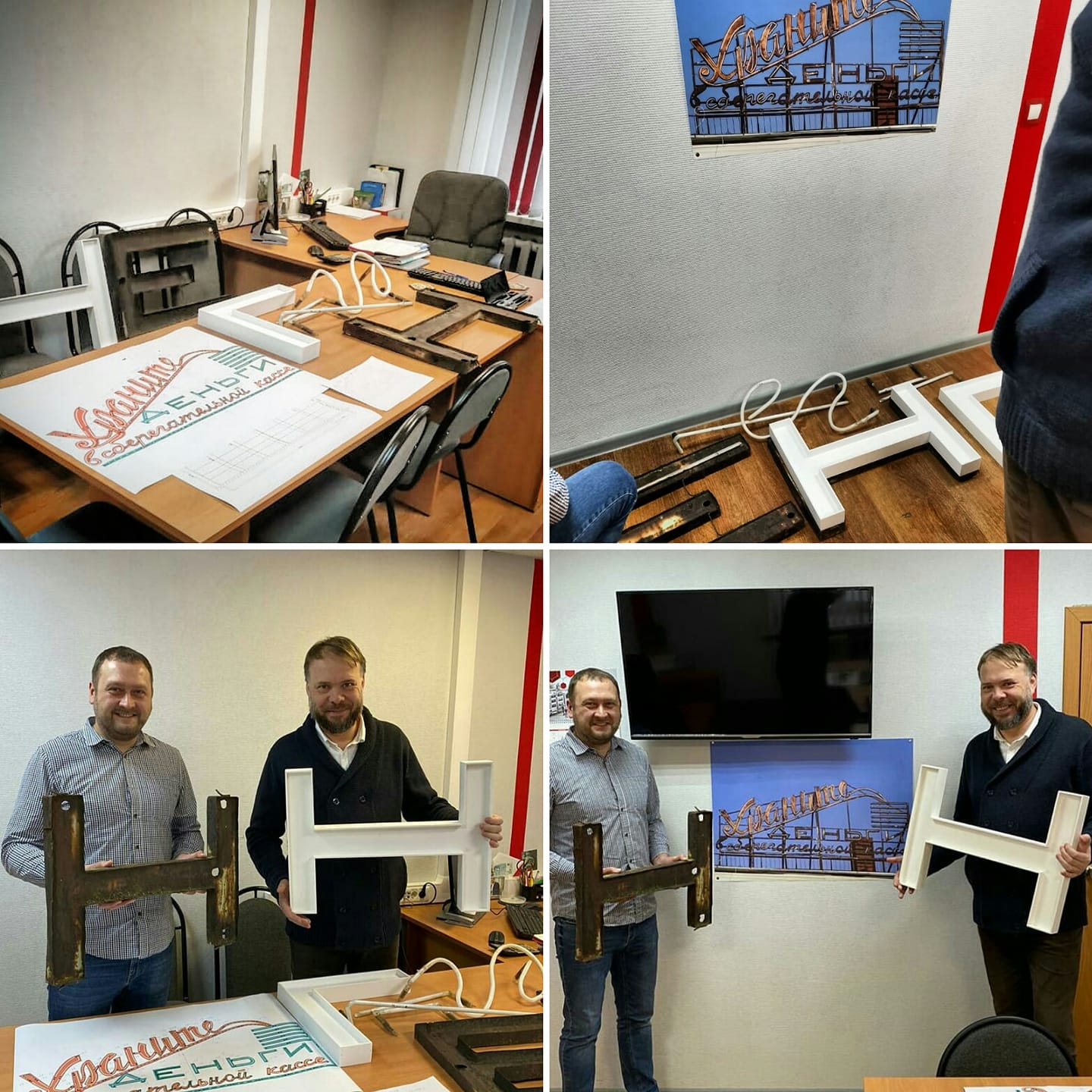 Алексей Комов рассказал, что вместе с руководителем организации, взявшейся за восстановление вывески 1966 года, которая располагалась на доме №59 по ул. Ленина, сверили по уже составленным чертежам компоновку недостающих деталей, раскладку неоновых трубок и конструкцию монтажной рамы под вывеской. Оказалось, что старая конструкция пришла в негодность и в любой момент могла обрушиться: