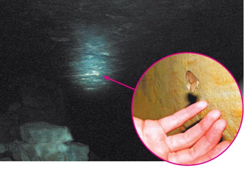 Чтобы понять, как мотылек мог дать такой невероятный след, нужно пояснить, как работает электронная камера. Во-первых, у нее имеется невидимый прожектор – освещающий поле зрения инфракрасный светодиод. Во-вторых, сформированное объективом изображение передается в память последовательно, точка за точкой. Как ни быстро протекает процесс, за время передачи кадра бабочка успевает несколько раз махнуть крыльями и сместиться. Кончики крыльев и образуют треугольные зубчики на треке. Понятно и ее «исчезновение» – удаляясь от фонарика камеры, насекомое быстро теряет яркость. Все сказанное не голая теория: похожие треки есть и в мировой сети. Есть такие и в нашем фотоархиве: на кадрах, снятых в пещерах (в частности, Кольцовских), нашлись похожие «привидения» от обитающих там бабочек-пядениц.