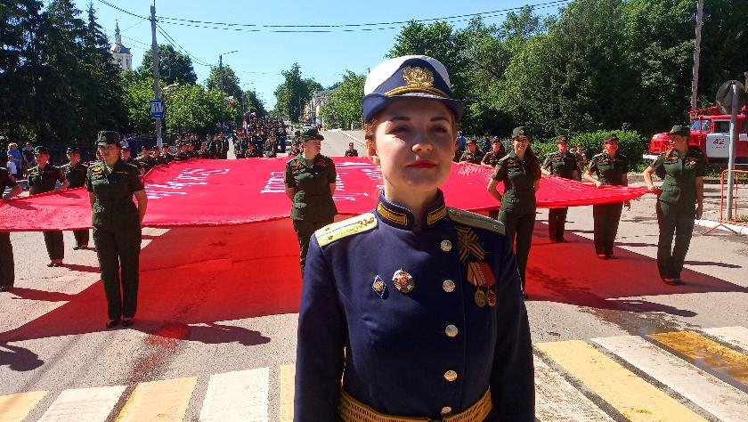 Традиционного митинга в этот день не было, как не было и прохождения военной техники, – она, начищенная до блеска, сгруппировалась чуть в стороне от шествия. Перед началом парада собравшихся ждало яркое зрелище – свои навыки ближнего боя продемонстрировал батальон охраны разведки. Помимо рукопашных схваток разведчики показали виртуозное владение оружием и выстроили живую пирамиду. В торжественном марше подразделений дивизии перед зрителями пронесли Знамя Победы, государственный флаг, символы ракетной армии. Честь нести главный символ праздника – огромное красное полотно – выпала девушкам-военнослужащим.