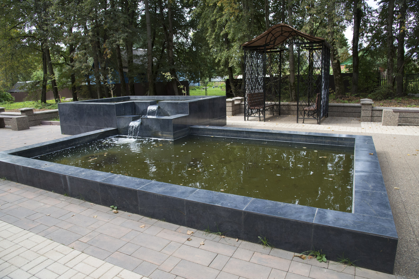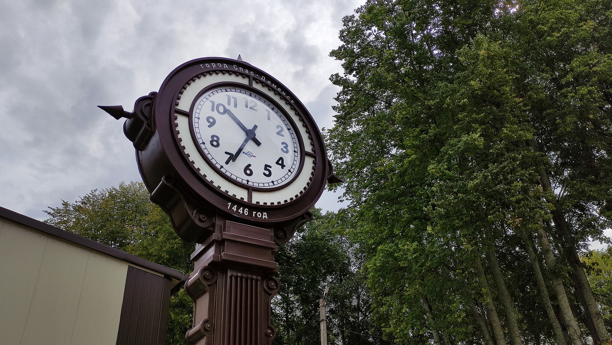 Отдельного внимания заслуживают озеленение парка и необычные архитектурные формы: радуют глаз альпийская горка, туи, сосны, ели, клены, фонтан и изюминка парка – часы СпасБен, под которыми мы сфотографировались на память.