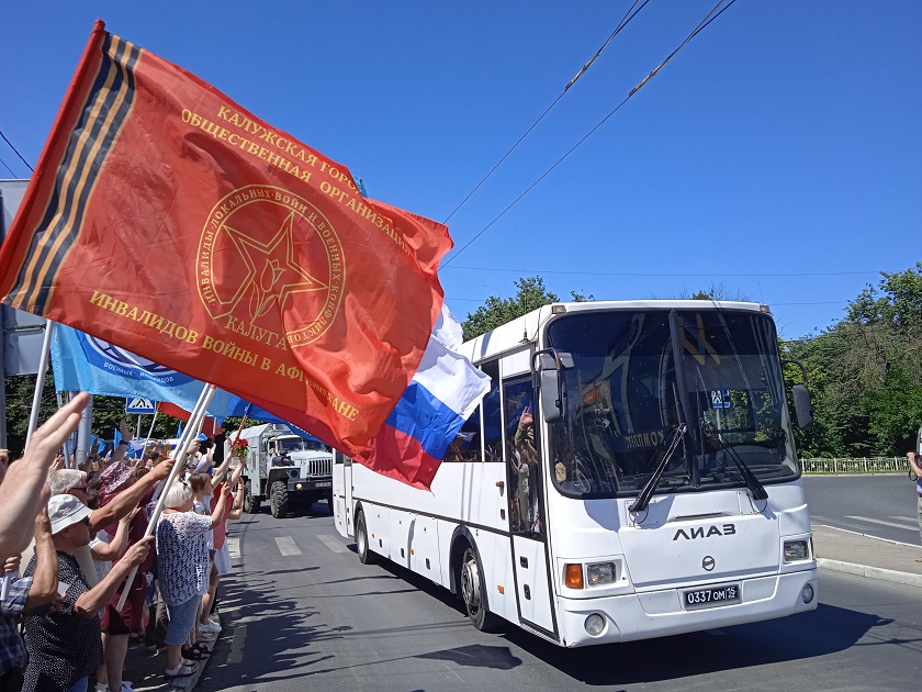 Автобус и автомобиль «Камаз» с участниками боевых действий проследовали от сквера Мира по улице Кирова. Акция состоялась у здания Арбитражного суда. В ней принял участие целый ряд общественных организаций: «Боевое братство», калужское региональное отделение общественной организации инвалидов войны в Афганистане и военной травмы – «Инвалиды войны», ДОСААФ, участники юношеских движений «Юнармии», «Волонтеры победы» и других. Выстроившись в ряд от сквера мира вдоль улицы Кирова. Калужане держали в руках российские трехцветные флаги.