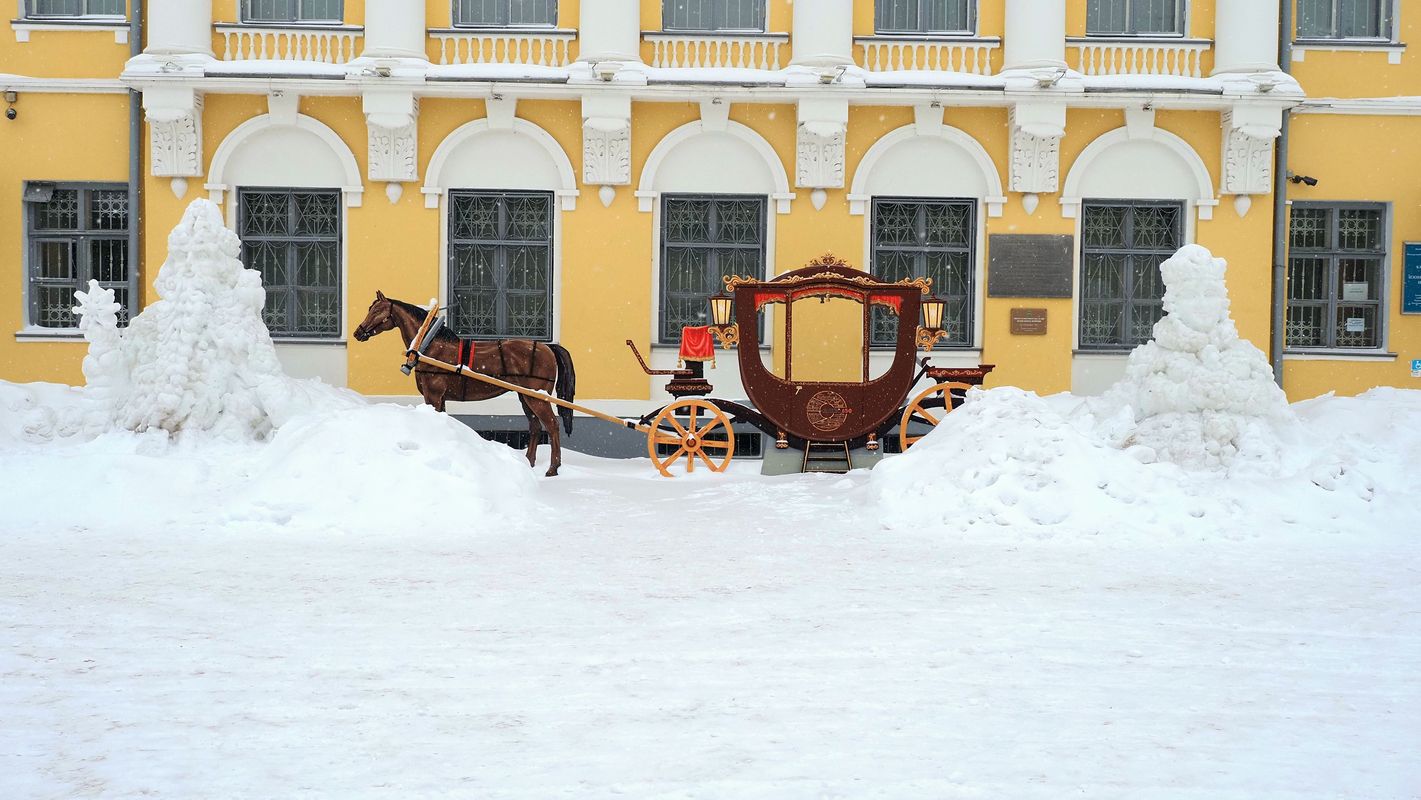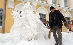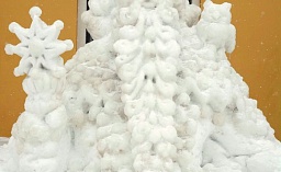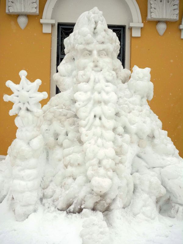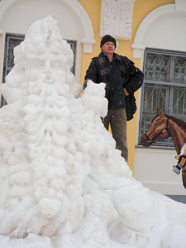 - Эскизы я создал по собственным наблюдениям за людьми, в основном в общественном транспорте – мужчинами с бородами и калужанками. А сами скульптуры сделал за три недели, вырезал из больших снежных массивов, которые сначала насыпал и формировал. Использовал разные техники, как бы чеканил снег, а потом даже занимался тонкой отделкой, потому в фигурах много деталей. В них можно увидеть традиционных Дед Мороза и Снегурочку. Кстати, серьги у нее я сделал, как у вятичей, а у Деда Мороза посох с вифлеемской звездой. А можно вообразить себе, что это фигуры императора Николая II и императрицы Александры Федоровкы. Или найти польский след - Лжедмитрия II и Марину Мнишек, потому что у нее такая своеобразная шапочка с рогами, - рассказывает мастер Валерий ИВОЧКИН