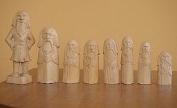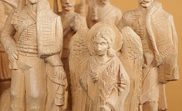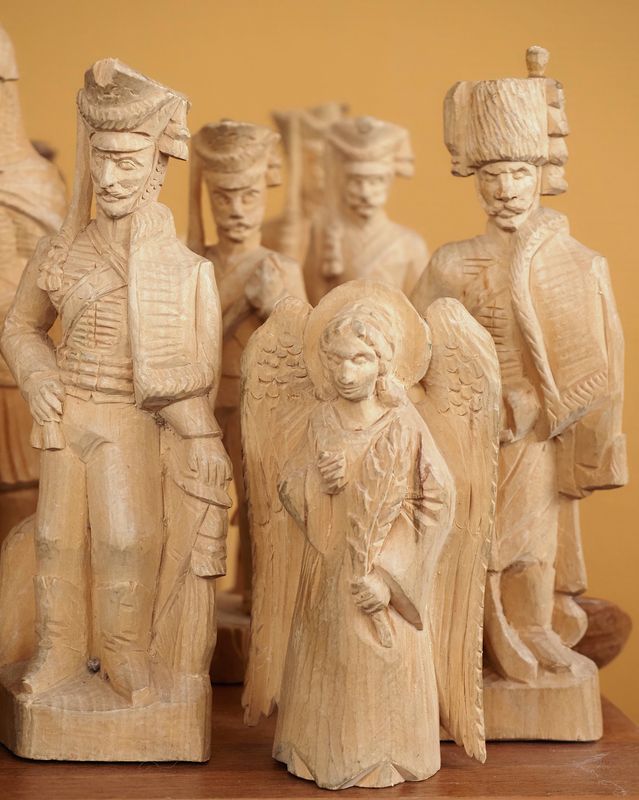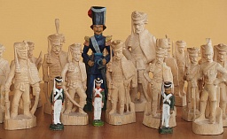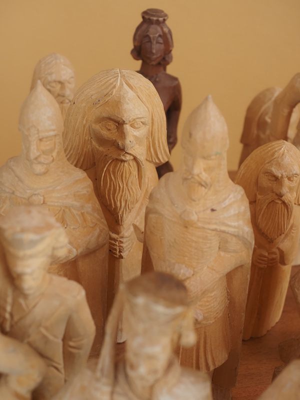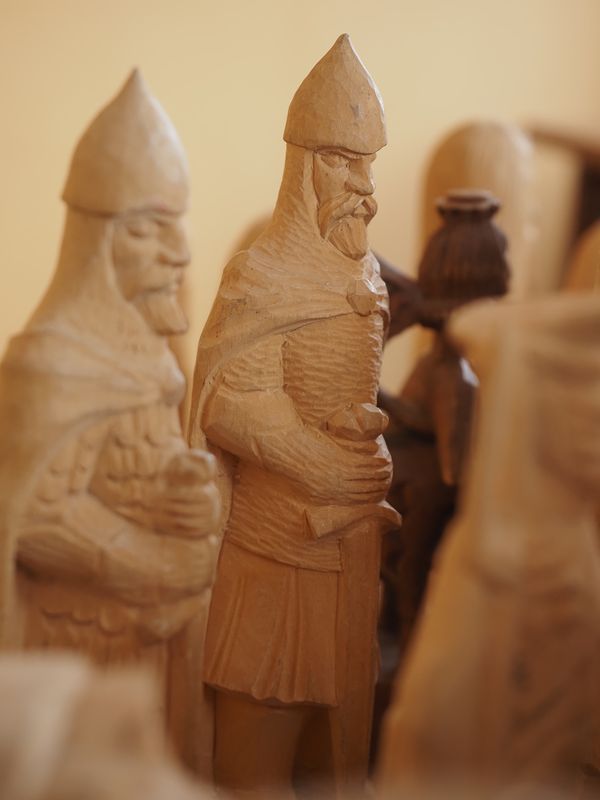 В рюкзаке, который мастер принес с собой, находились его работы, которые мы потом с большим интересом рассмотрели. Среди них была славянская мифическая птица Гамаюн. Ее изобразил в свое время Виктор Васнецов, чье имя носит художественно-промышленный колледж, который закончил калужанин. Возможно, оттуда отчасти и растут корни его собственного творчества. Оно включает в себя графику – он зарисовал наличники нескольких уже не несуществующих деревянных домов на калужских улицах, принимал участие в создании нескольких иконостасов. Но самое главное – это резные деревянные фигуры. Их в принесенном рюкзаке было целое войско.Это характерные персонажи - русские воины, связанные со Стоянием на Угре, и солдаты русской армии, принимавшей участие в Отечественной войне 1812 года. Они оригинальны, каждый со своим лицом. В этом главное отличие авторской манеры калужанина от тех, кто занят, например, изготовлением богородской игрушки в Сергиев-Посаде. Те просто создают образ, лишенный четко выраженных черт, а не характер. Хотя тоже, как и у Ивочкина, делают свои работы в основном из липы. А у него они получаются разные. Вырезать их мастеру всегда непросто – работа кропотливая. Ему нужно сделать не менее двух тысяч специальных технических приемов в процессе. Но именно этим они и интересны.