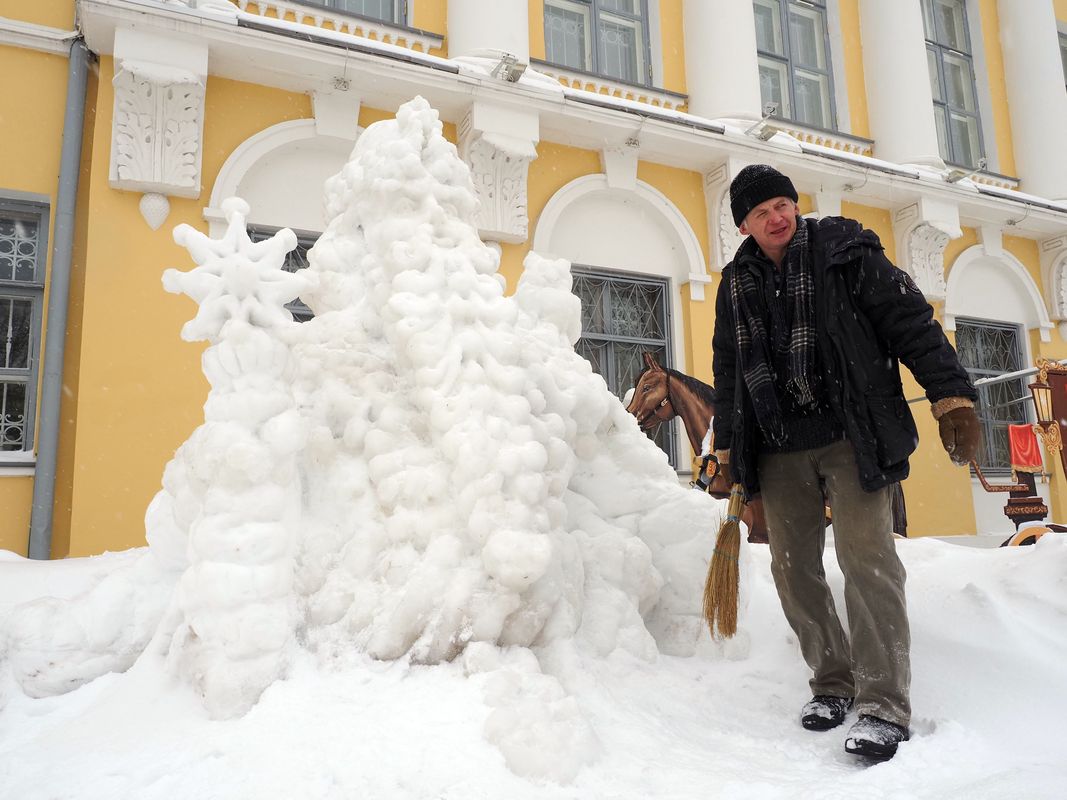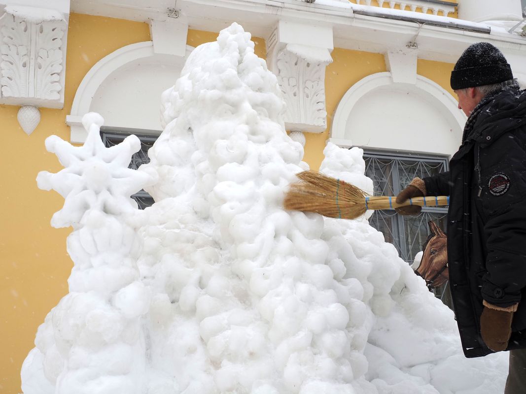 Он пришел к своим работам с большим рюкзаком за плечами и первым делом занялся их очисткой от запорошившего их снега. Сами мы поначалу не обратили особого внимания на то, как сделаны эти Дед Мороз и Снегурочка, стоят себе две снежные головы. Но с ними не все так просто. Оказалось, у этих ледяных скульптур много деталей, которые придают им разные смысл и значение.