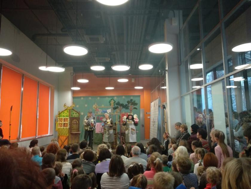 Желающих посмотреть представление Калужского театра кукол было так много, что мест хватило не всем: многих малышей родители держали на плечах, а кто-то смотрел сквозь стеклянные стены зала коворкинга из коридора.