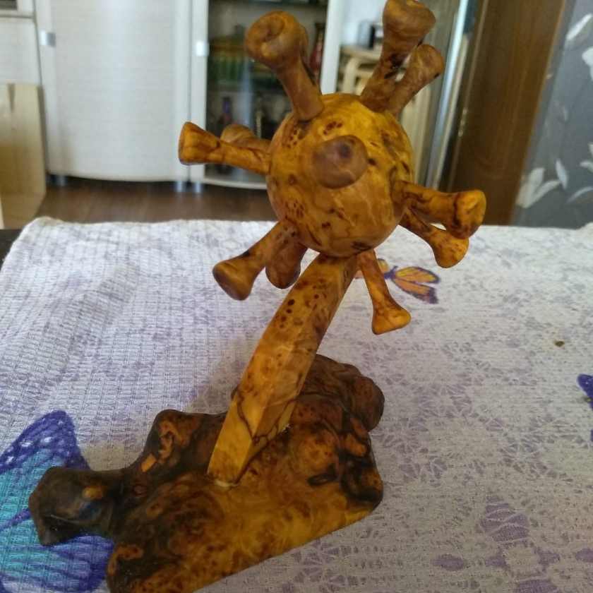 Скучая дома, Владимир вспомнил еще одно давнее увлечение: в школьные годы он учился резьбе по дереву во Дворце пионеров. И в доме запахло деревом: рамочки, изящные вазочки, хлебные корзинки… Деревянные скульптуры - от пера с чернильницей, вырезанных из единого куска дерева, до скульптурного изображения молекулы «Ковид-19», вырезанной во времена пандемии.