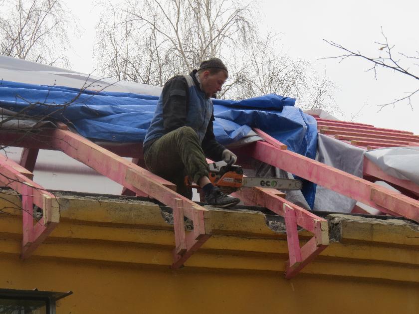 Замену крыши проводит подрядная организация ООО СК «Бастион». Она выиграла почти все городские тендеры на этот вид работ. На объекте трудятся четыре человека. Они ведут демонтаж старой и монтаж новой крыши. Бригадир Сергей Воробьёв рассказывает, что для каждого дома разработан свой проект, которому они строго следуют.– Сначала мы демонтируем крышу, но не всю сразу – частями, и над каждой открытой частью надстраиваем каркас. Крышу покрываем гидроизоляцией. Когда каркас будет полностью собран, заказываем металл. Пока идёт закупка материалов, очищаем и утепляем минеральной ватой чердачное помещение. Планируем завершить монтаж деревянного каркаса к концу марта, и за две-три недели новая кровля будет готова, – поясняет Сергей Воробьёв.