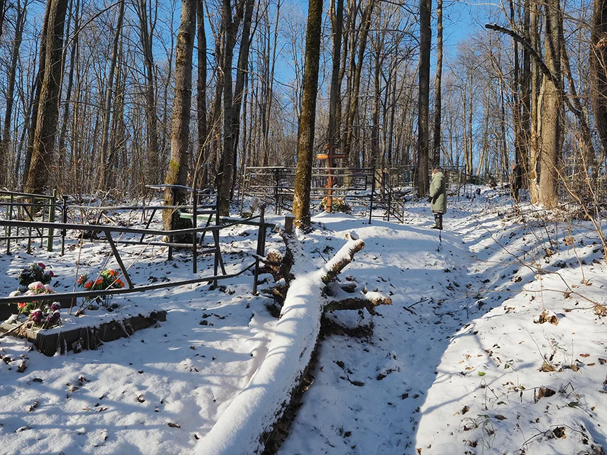 Холм густо порос лесом, но солнце ударило сквозь деревья, и мы увидели очертания склонов. Тропинка наверх есть. Попробуем подняться. Из–за стволов показались кресты, ограды.
