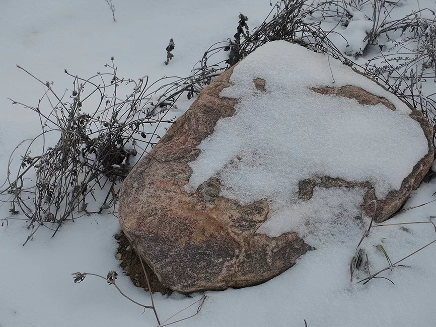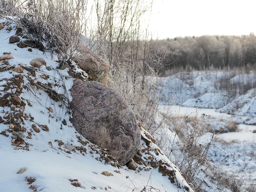 Оказалось, что Шатер–гора – своеобразный торт «Муравейник». Он состоит из окатанных камней разной величины, глины, песка. Заглянуть внутрь тысячелетних процессов мы смогли на карьере рядом с райцентром – из массы грунта торчали каменные «цукаты» и «изюмины». Огромные валуны в «начинке» – редкая находка. Их ледник, как правило, оставлял по дороге. Один такой мы увидели в Износках у школы. Зима, которая в этот день вспомнила, что она зима, надела ему снежную шапку.