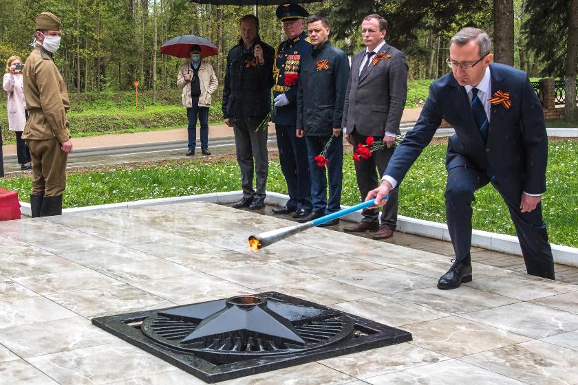 В церемонии зажжения Вечного огня приняли участие руководитель области Владислав Шапша и врио руководителя районной Управы Андрей Хохлов. Впервые за долгие годы на площади перед мемориалом не было ветеранов войны. Конечно, о них не забыли, просто сейчас важнее позаботиться о здоровье и безопасности пожилых людей. В руки главы региона передали факел, и через мгновение на мемориальном комплексе разгорелось пламя. Немногочисленные участники торжества почтили память павших минутой молчания и возложили цветы.В своей торжественной речи Владислав Шапша подчеркнул, что нельзя оставаться равнодушным, находясь на этом памятном для всего народа месте, где пролилась кровь тысяч солдат. Каждая пядь земли этой высоты выжжена огнем войны.