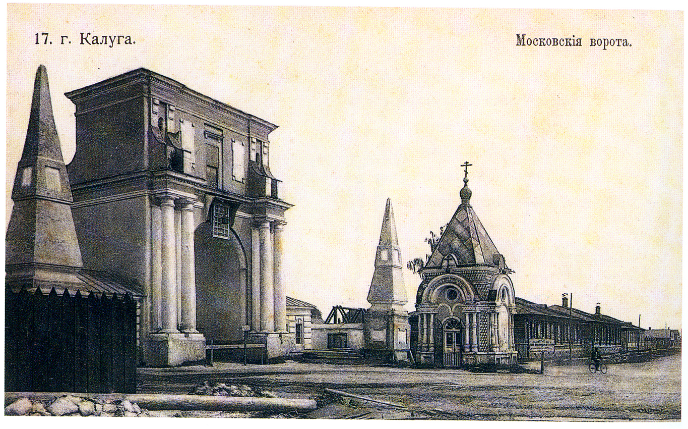 Практически в каждом городе императрицу во время ее поездок встречали триумфальные ворота, в том числе в Серпухове и Туле. Однако ни в одном из этих городов они не сохранились. Вероятно, к приезду государыни на въезде в город строились временные деревянные арки, которые должны были выражать верноподданнические чувства и символизировать признательность горожан императрице за высочайшее внимание. Такое же временное сооружение на въезде в город со стороны Тулы было построено и в Калуге.Московские же каменные ворота появились позже, в 1780-х гг., в рамках перестройки губернского города по новому, высочайше утвержденному, плану. Об этом свидетельствует отсутствие обозначения Московских ворот как капитального строения на планах 1776 и 1778 гг., а также полное игнорирование этого монументального сооружения в подробных записках адъюнкта Санкт-Петербургской академии наук В.Ф. Зуева, посетившего в ходе научной экспедиции Калугу летом 1781 г.