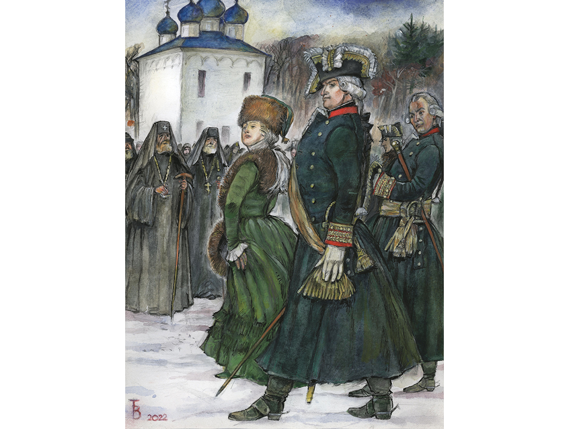 17 (28) декабря в 10-м часу Екатерина «соизволила с фрейлинами и кавалерами завтракать». После этого «в провожании многочисленного народа, при колокольном звоне и пушечной пальбе из оного города Калуги соизволила восприять отсутствие». Путь ее лежал на Москву. По дороге императрица заехала в Лаврентиевский монастырь, располагавшийся в трех верстах от города. Перед Святыми вратами Екатерину встретил архимандрит с братиею. В церкви «соизволила прикладываться к Святым мощам и иконам». Из храма в сопровождении архиепископа Платона и всего духовенства императрица «шествовала по постланному сукну в кельи Архимандрита, где, пробыв малое время, соизволила Ея Величество отправиться в путь в Москву».*В рамках проводимой с 1775 г. губернской реформы не существовало никакого различия между губернией и наместничеством. По сути, эти термины выступали синонимами, обозначая разными словами одну и ту же административно-территориальную единицу, и на практике два этих названия параллельно использовались в нормативных и делопроизводственных документах.