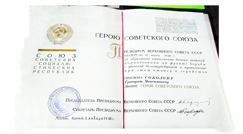 21 марта 1940 года за мужество и воинскую доблесть, проявленные в боях с врагами, Григорий Соколов удостоен звания Героя Советского Союза. Ему была вручена медаль «Золотая Звезда» № 270.