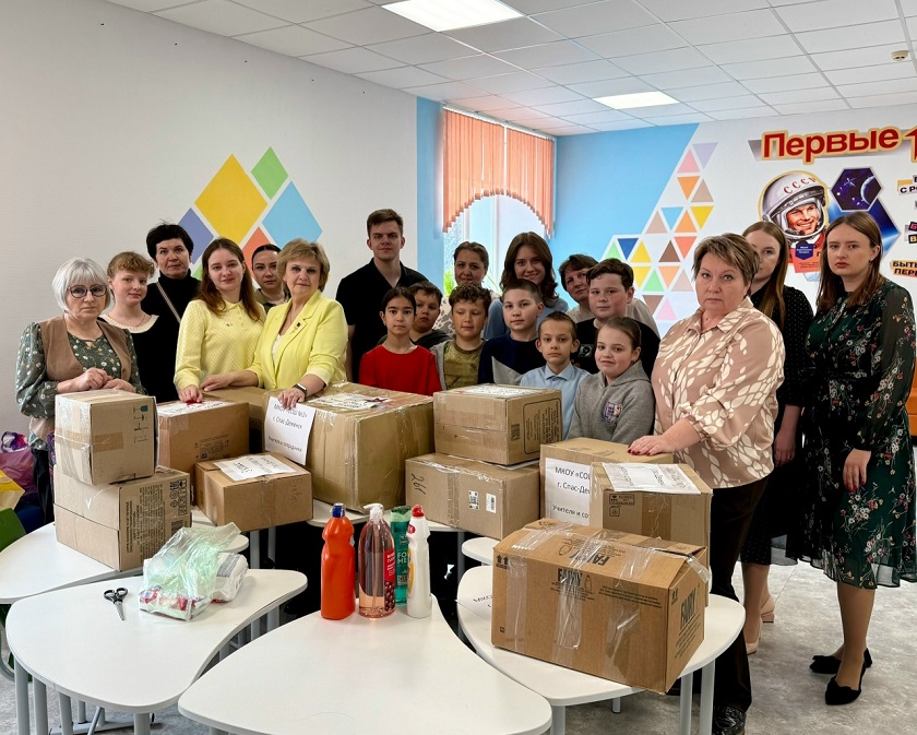 Школьники и учителя подготовили почти два десятка коробок гуманитарного груза с продуктами питания, предметами личной гигиены и другими необходимыми для участников СВО вещами, после чего передали их в волонтерский штаб «Спас для Победы».