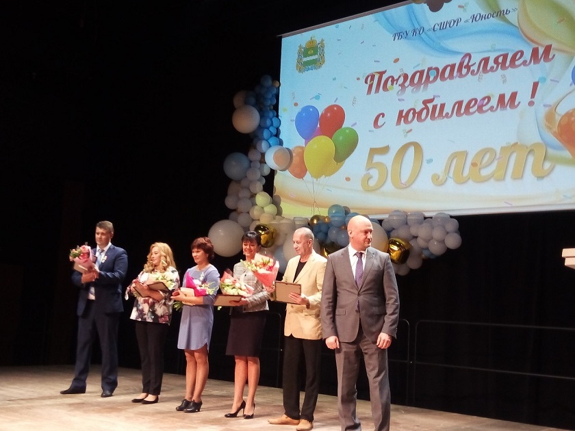 Ветераны спорта, тренеры и спортсмены принимали поздравления от и.о. заместителя губернатора области Владимира Попова и от директора спортшколы Алексея Демкина.
