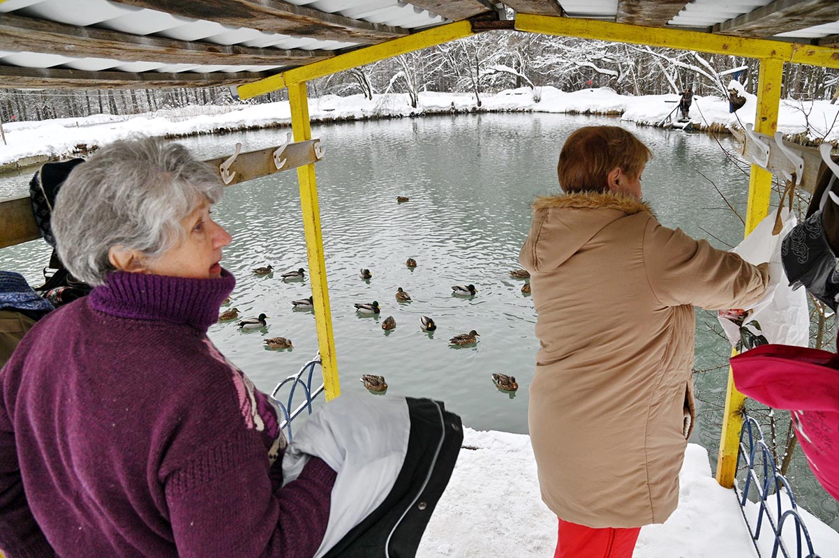 Отношение к уткам у людей разное. Есть те, кто возмущается: «После них вода грязная - не зайдешь!» Другие снимают птиц на фото и видео, подкармливают, а окунаться предпочитают в специально оборудованной купели. С одной из купальщиц мы познакомились. Надежда уже несколько лет приходит сюда.
