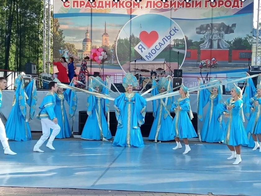 Свои поздравления адресовали виновникам торжества и творческие коллективы, в том числе участники школы ирландских танцев «Айрин», хореографической студии «Калинка», «Виват», а также солисты районного Дома культуры.Традиционно мосальчане посмотрели демонстрационные полеты на самолете военно-исторического аэроклуба «Нормандия – Неман» и прыжки с парашютом ГАСПК г. Калуги.