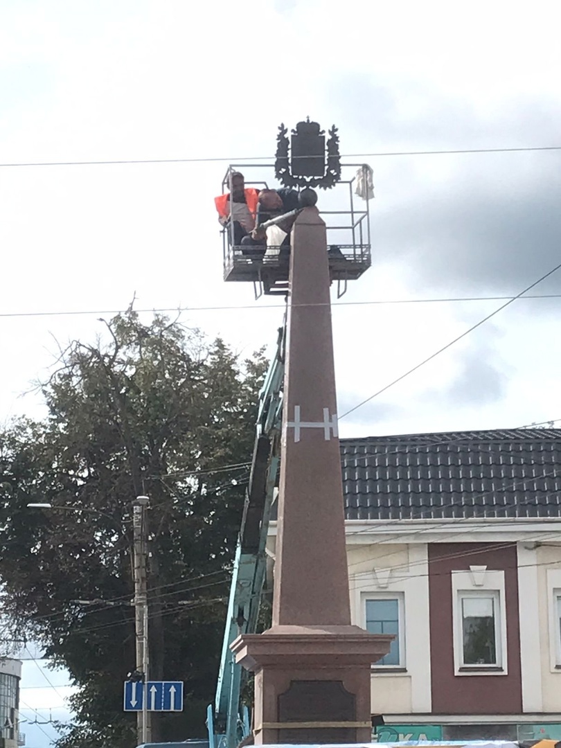 Главный архитектор Калуги Алексей Комов рассказал о последних штрихах в установке стелы в центре города. Так, на вершину обелиска уже водрузили выполненный из бронзы герб Калужской области. На постаменте установили бронзовые картуши с текстом о присвоении городу почетного звания.