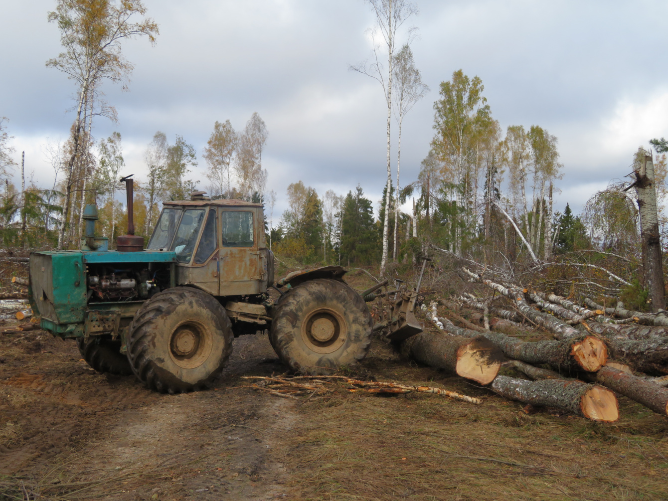 Над расчисткой местности, где ранее располагался льнозавод, трудится бригада рабочих. Основной объем работ они выполняют вручную. Сначала дерево спиливают и очищают от сучьев, затем трактор лебедкой стаскивает бревна ближе к дороге и только после этого вывозятся спецтехникой.