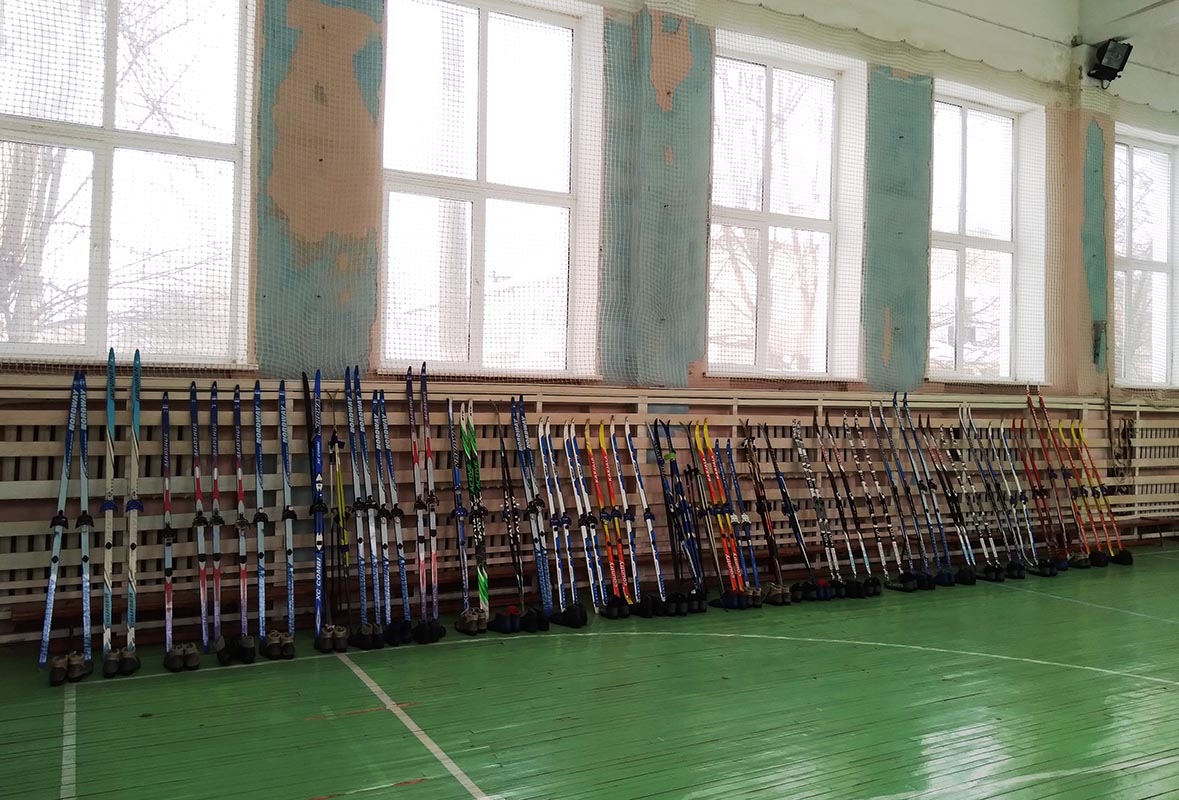 Заходим в спортзал. Оказывается, никакого дефицита инвентаря нет. Школа обеспечена лыжами, даже с запасом. Вдоль стены стоят лыжи как для учеников младших, средних классов, так и для старшеклассников. Одновременно урок физкультуры может проходить в двух классах общей численностью 60 человек.