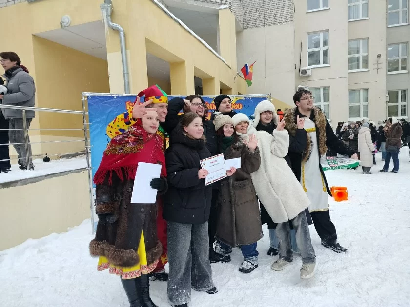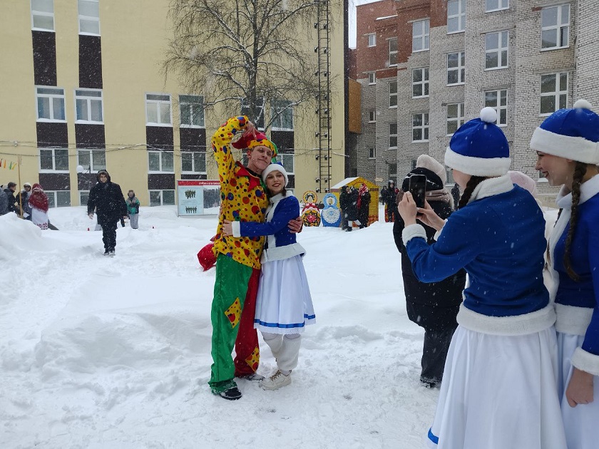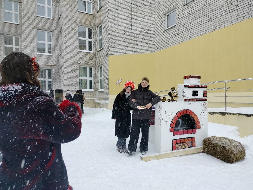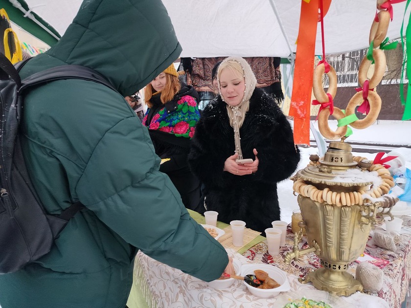Музыка и ароматный запах блинов разливались по всей территории внутреннего двора университета и, словно магнитом, притягивали студентов на масленичные гуляния. Для всех желающих насладится праздничными угощениями стояли палатки, в которых можно было взять блины и добавить к ним совершенно разную начинку.