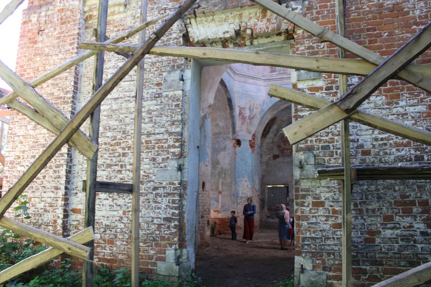 Радость и праздник в этих стенах, можно надеяться, надолго. Ведь сейчас начались работы по восстановлению церкви - уже установлены строительные леса, опилены деревья на крыше.