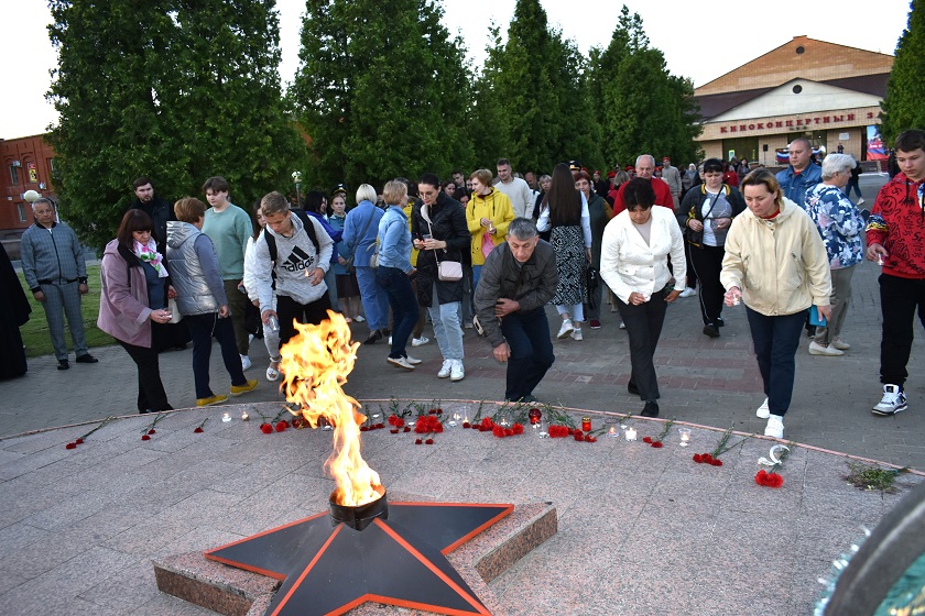 Участники акции прошли к Вечному огню. Они почтили память павших Минутой молчания, а затем возложили цветы и свечи к памятнику Неизвестному солдату. У мемориала зажгли множество свечей.