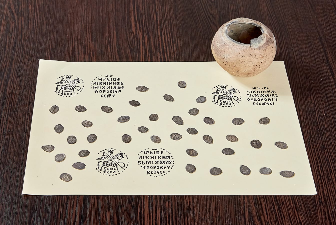 – Серебряные монеты-чешуйки имели большое распространение по стране. Такие денежные единицы находились в обращении довольно долго: мы встречаем их на протяжении всего XVI века и далее. На них изображали всадника с мечом или копьем, делали надписи с именем царя. Таким образом, монеты служили идентификатором того, что территория, где они обращались, подчинялась Москве. Каждый год монеты чеканились с нового чекана, причем его рисунок, начертание букв всегда немного отличались, поэтому можно с большой точностью определить дату их изготовления. Когда клад поступил в музей, специалисты осмотрели все монетки, разложили их по годам. Оказалось, что последние выпущены в 1617 – 1618 годах, поэтому было сделано предположение, что схрон с улицы Монастырской связан с нашествием гетмана Сагайдачного. Вообще это большая редкость, когда с точностью до года можно определить время находки, – поясняет Владислав Попелов.