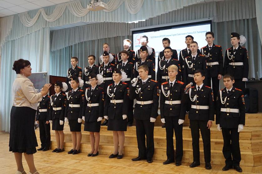 В актовом зале образовательного учреждения царило праздничное настроение. Особенную торжественность атмосфере придавала парадная форма кадетских классов. Поисковый отряд «Русская земля» выставил на всеобщее обозрение свои находки времен войны - они как магнит притягивали внимание ребят.Москвичи вспоминали свой поход по местам боевой славы и гибели Паперника, о том, как поклонились праху его и других героев-красноармейцев на Думиничской земле.