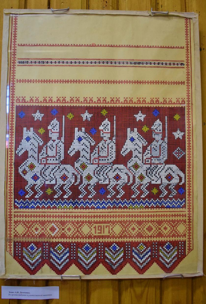 Сейчас даже трудно представить, что в конце шестидесятых годов прошлого века на фабрике работали 800 (!) человек вместе с вышивальщицами-надомницами — для маленького города цифра просто невероятная. Был даже открыт филиал фабрики в селе Высокиничи. Об этом свидетельствует документ из музейных архивов - справка, написанная бывшим директором предприятия Татьяной Яковлевной Пивоваровой. О «золотом веке» тарусского предприятия, славившегося когда-то на весь Советский Союз, рассказывают и многочисленные фотографии из семейных альбомов тарусян. Самая многочисленная Первомайская колонна сотрудников в праздничном шествии, поездки, коллективные мероприятия, рабочие моменты в фабричных цехах... Кстати, в свое время единственным цехом, который работал в одну смену, был цех пландёржки (это особая техника подготовки полотна). Остальные цеха трудились в две смены.Для многих гостей выставки тарусская фабрика — личная биография и судьба. Одна за другой выходили поделиться воспоминаниями ветераны производства, и все они говорили о своей фабрике с гордостью и ностальгией. С шестнадцати лет трудилась на пландёржке Нина Акишина, создавая на льняном полотне ровные клетки, вокруг которых потом ходит, обвивая каждую, короткая швейная игла. Помнит она всех бабушек-мастериц, которые обучили тонкостям ремесла, а потом уже и сама готовила молодых вышивальщиц, выучила четырнадцать человек. С 1962 по 1990 год работала в гладильном цехе Нина Санкина, легко управляясь с тяжелыми пятикилограммовыми утюгами. Молоденькой девчонкой пришла на фабрику в цех пошива Раиса Палчук. Много теплых слов было сказано о замечательных специалистах, которых уже нет с нами — Нина Чуфистова уже в очень преклонном возрасте сама создавала эскизы узоров, до последних дней сохраняя любовь к родному промыслу.