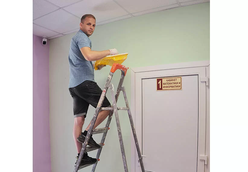 Сегодня в школе всего 49 детей. Некоторые из них даже на каникулах заглядывают сюда. Кто-то отрабатывает трудовую практику на школьном цветнике, другие захотели помочь взрослым с ремонтом. Сельская детвора умеет все. Кстати, как и их учителя. Мы застали Романа Викторовича за покраской стен в коридоре школы, которая регулярно обновляется перед началом учебного года.
