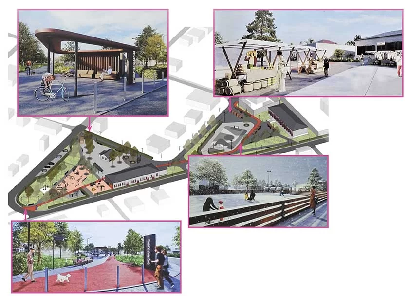 90-х, когда здесь шла торговля местных жителей продукцией со своих дач и огородов. В 2000-х там размещалось кафе с незабываемыми вкусными пирожками. В реставрированных домиках будет современное кафе со столиками-бочками (что тоже отправляет к символу города - его гербу). По просьбе жителей сохранится родник, он превратится в питьевой фонтанчик.