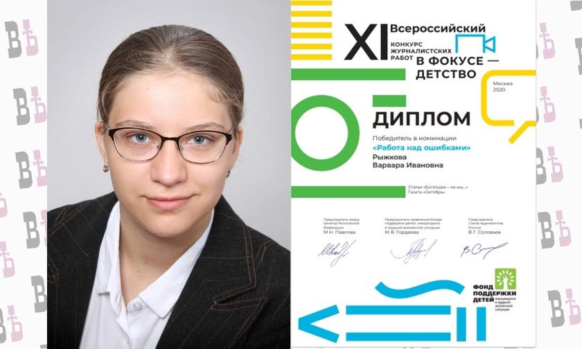 Публикация «Богатыри – не мы…» в районной газете «Октябрь» стала для молодого автора «путеводной звездой» к победе в номинации «Работа над ошибками» среди юнкоров. В списке победителей фамилия талантливой жительницы Калужской области числится первой из четырех. Ее соратниками по номинации стали молодые журналисты из Московской, Томской и Белгородской областей.