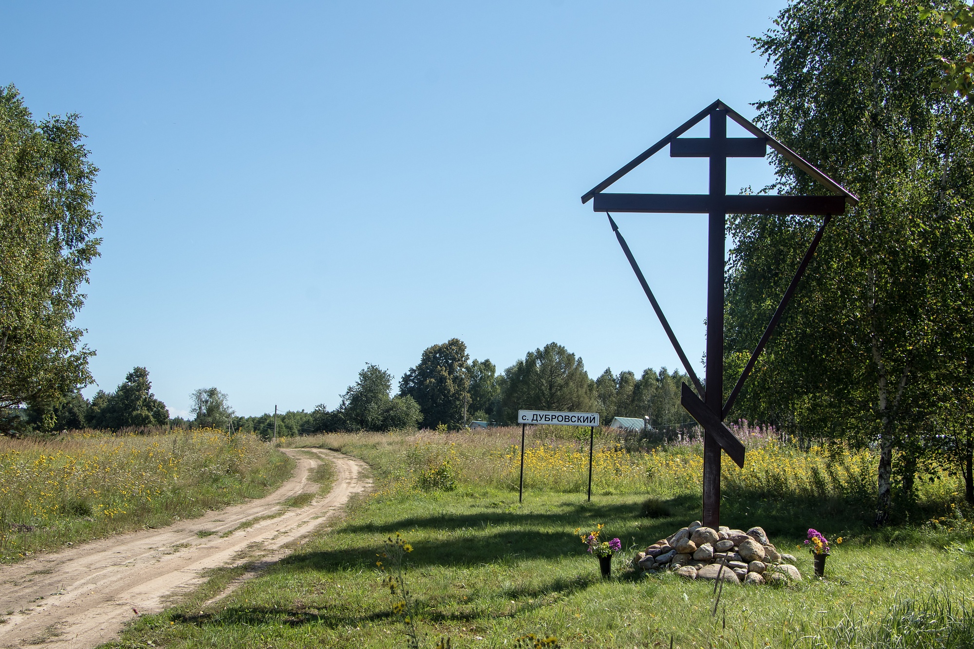 Но вот из-за поворота появляется вывеска «Село Дубровский» (именно такой статус сейчас имеет этот населенный пункт). При въезде - массивный поклонный крест, установленный этой весной, рядом с ним цветы.