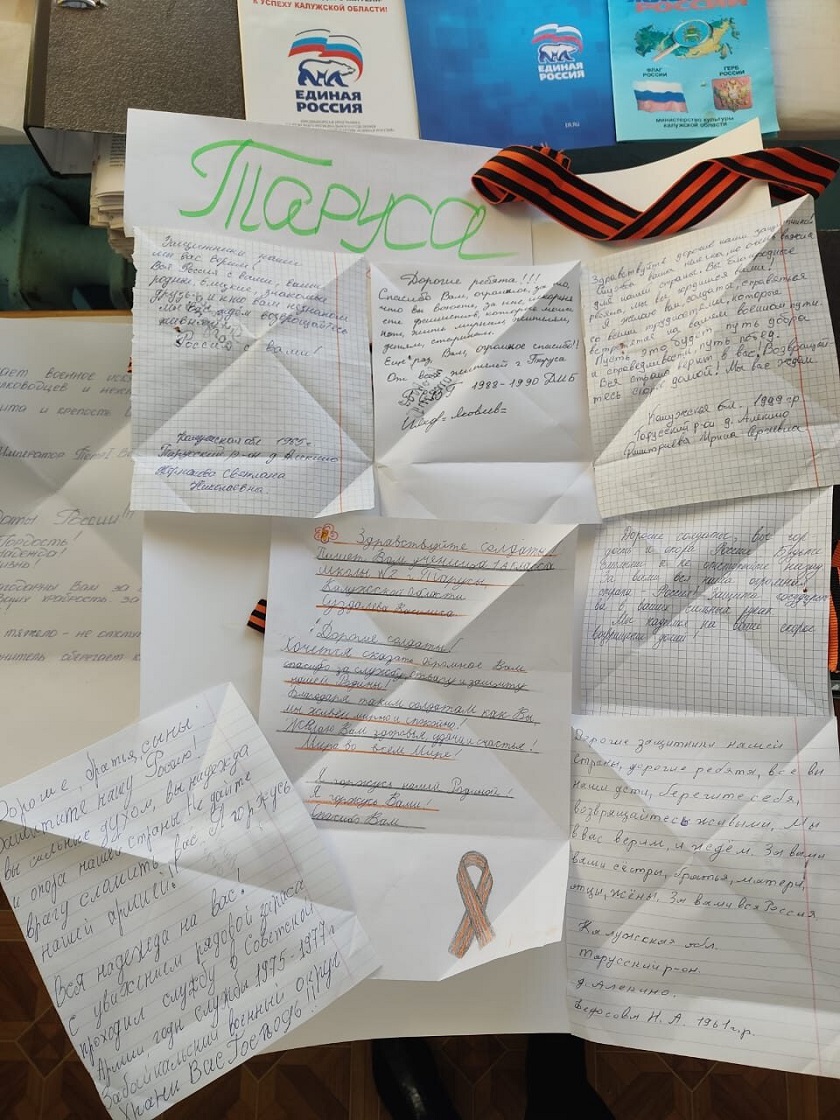 Тарусяне разных возрастов откликнулись на акцию «Напиши письмо солдату», организованную всероссийской партией «Единая Россия». Незнакомым героям современности отправляют целые плакаты, украшенные георгиевскими лентами.
