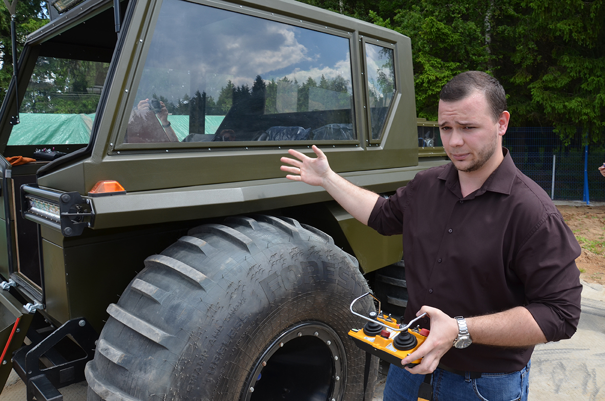 - Наша главная идея и задача – в первую очередь обезопасить пилота. В случае необходимости он может отойти и управлять техникой дистанционно. Во время тестирования машины мы загоняли ее в самые большие буераки, топили, переворачивали. Она показала себя хорошо. Но нет предела совершенству, поэтому мы перешли к следующей платформе, - рассказал генеральный директор ООО «МПК-Сталь» Дмитрий Карасёв.