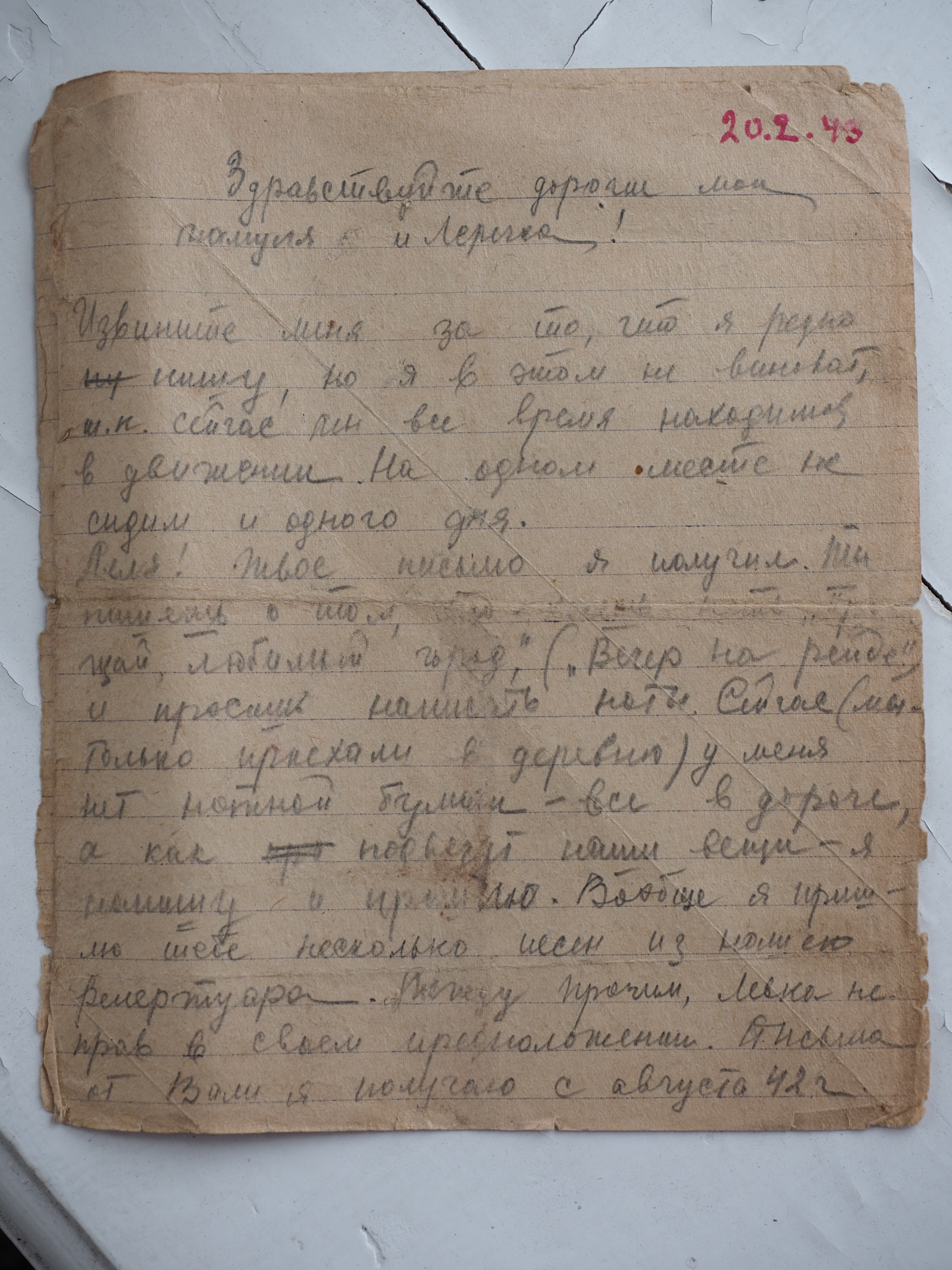 Леля! Твое письмо я получил, ты пишешь о том, что хочешь ноты «Прощай, любимый город» («Вечер на рейде»), и просишь написать ноты. Сейчас (мы только приехали в деревню) у меня нет нотной бумаги, всё в дороге, а как подвезут наши вещи, я напишу и пришлю. Вообще я пришлю тебе несколько песен из нашего репертуара. Между прочим, Лёвка не прав в своем предположении, письма от Вали я получаю с августа 42 г. Она по-прежнему такая же заносчивая, как и была.