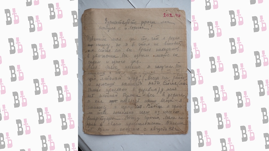Это письмо отослал в феврале 1943 года своим родным, находившимся в эвакуации в Челябинске, Альбин Дрейзин, сын калужского композитора и дирижера Евгения Дрейзина, который написал музыку для вальса «Березка». Альбин Евгеньевич в 1937 году окончил калужскую школу №5, где в музее и хранится ныне оригинал письма, и тоже стал музыкантом. На фронте он был руководителем армейского ансамбля. Его сестра носила редкое имя Элегия, в письме он называет ее Леля и Леречка. Дата в правом верхнем углу проставлена красными чернилами, само письмо написано простым карандашом на обычном листе тетрадной бумаги в линейку, свернутой в треугольник.