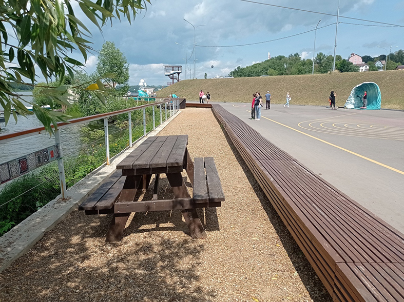 Среди того, что запланировано сделать: установить перголы и парклеты (небольшая зона отдыха) с качелями, разместить пять трибун с навесами на склоне между верхним и нижним ярусами, оформить спуск к воде из террасной доски из лиственницы, установить кафе (это будет нестационарный торговый объект) на площади 200 кв. м. Это как минимум.