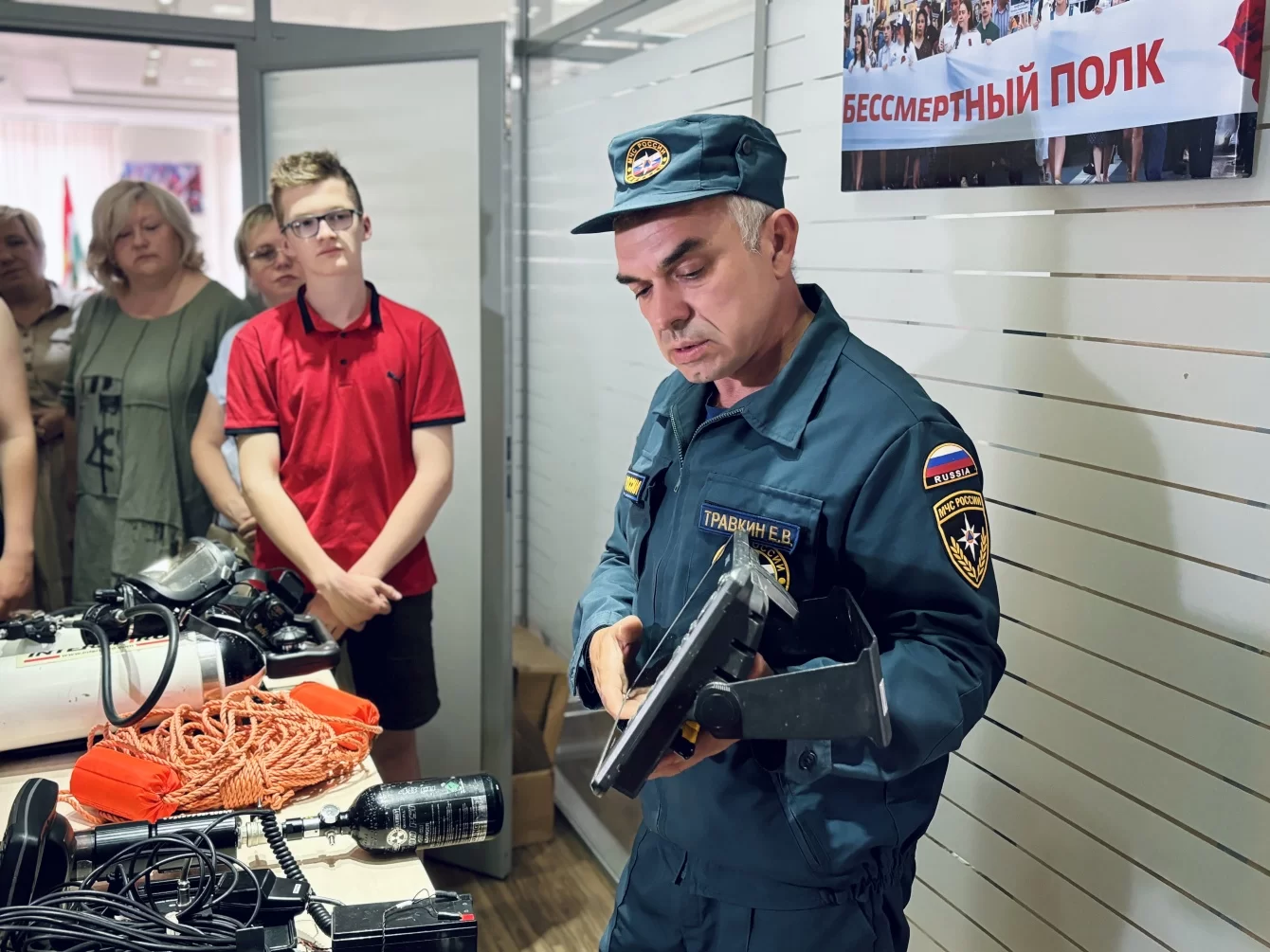 Перед началом урока спасатели продемонстрировали ребятам водолазное оборудование и рассказали, как им пользоваться. Теории любознательным школьникам было мало: каждый рвался потрогать компас, померить перчатки и полистать блокнот для подводных записей. Вопросы специалистам не утихали. Как выяснилось, умение плавать совершенно не нужно водолазу, ведь он ходит пешком и помимо баллона с кислородом обязательно берет с собой арсенал нужных приборов.