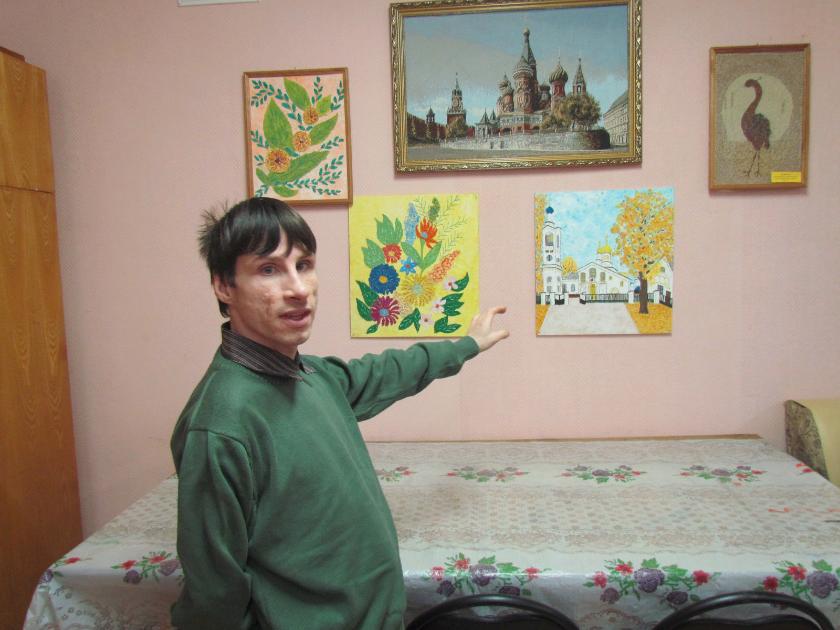 Сергей Ловчев проживает в Жиздринском психоневрологическом интернате с 2010 года. Он инвалид II группы. С рождения Сергей страдает тяжелыми нарушениями опорно-двигательного аппарата. Но, несмотря ни на что, это жизнерадостный, энергичный, общительный, активный и очень творческий человек. Еще в детстве Сереже очень нравилось рисовать. Постепенно простое увлечение стало смыслом его жизни, а детские рисунки превратились в чудесные картины. Больше всего он любит рисовать природу и храмы. Самое удивительное, что многие работы Сергея выполнены не только гуашью, а кропотливо «собраны по крупицам», то есть выложены из различных круп: гречневой, овсяной, рисовой, пшенной и других.