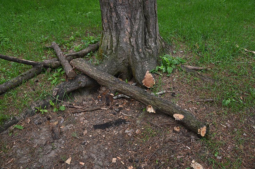 Пострадавшая сосна оказалась совсем рядом. У земли, там, где были выступающие корни, свежий спил, вокруг разбросаны поленья.