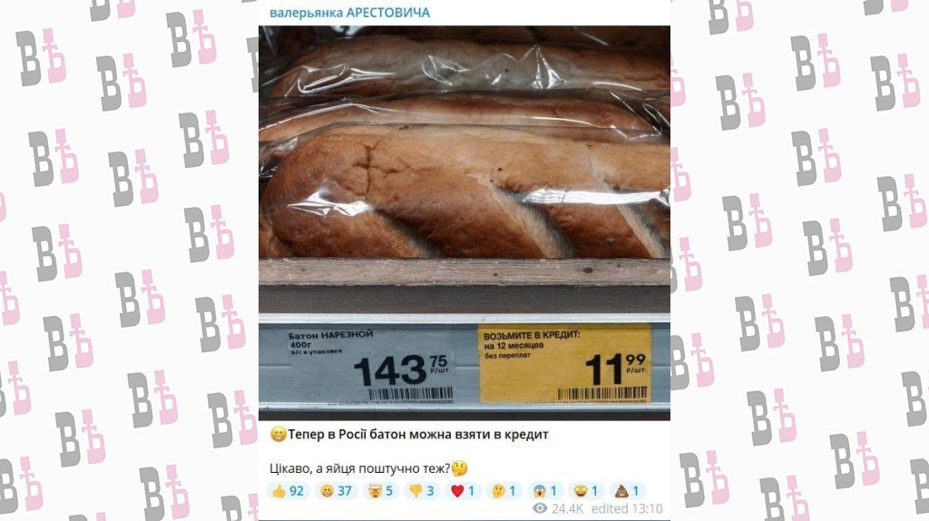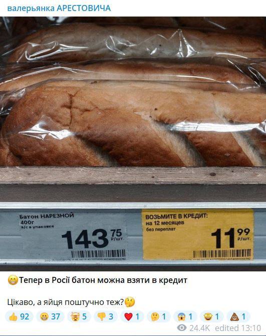 Один из украинских телеграм-каналов опубликовал фотографию прилавка с нарезным батоном за 143 рубля и его ценой в кредит. Расследователи из телеграм-канала «Война с фейками» попробовали отсканировать штрих-коды с фотографии, чтобы проверить торговую сеть, продающую «хлеб в кредит». Но оба штрих-кода фальшивые, они не считываются сканером. Кроме того, пользователи фоторедактора не подумали о математике: суммы кредита и полной цены не сходятся. Реальные цены на нарезной батон в России совершенно другие – от 30 до 60 рублей, в зависимости от производителя и веса.